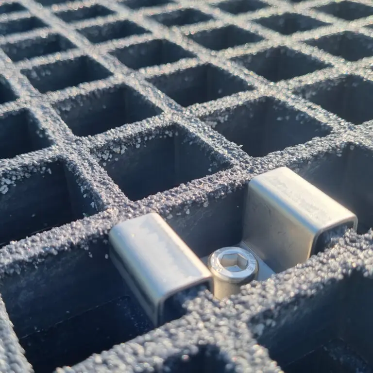 FRP moulded grating clips use the hole apertures in the grating to secure, connect, or clamp the sheets to the sub-structure.