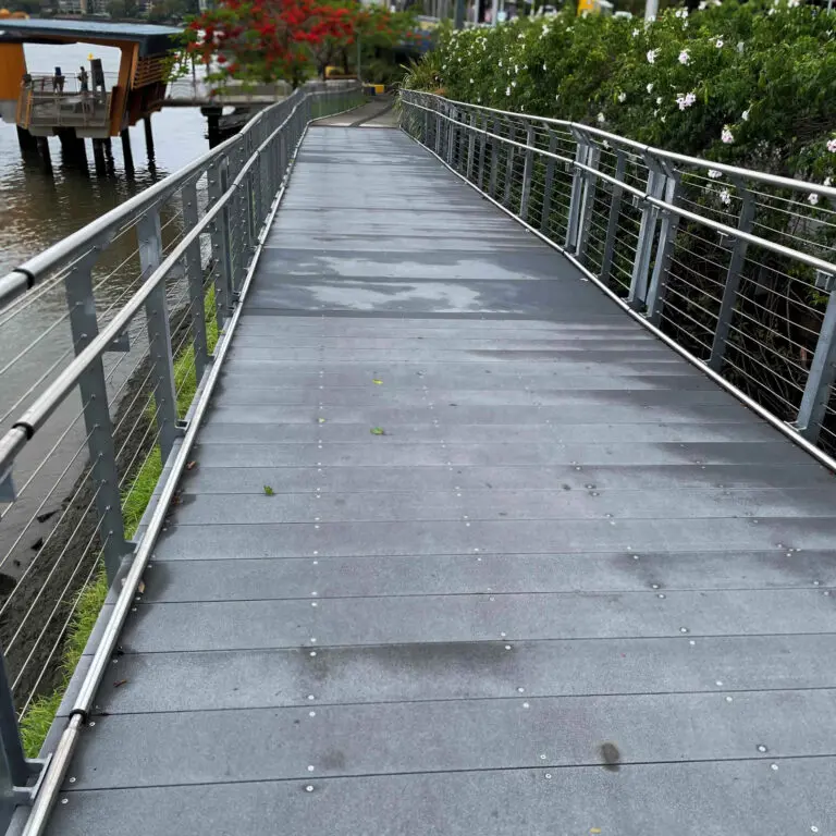 FRP Pultruded Decking is an engineered decking solution made from pultruded fibreglass reinforced polymer (FRP). FRP is a composite material made from a thermosetting resin, reinforced with glass fibres. Pultruded decking profiles deliver a high strength decking system, making them ideal for public infrastructure applications such as pedestrian bridges, walkways, and platforms where durability, load-bearing capacity, and long-term performance are essential.